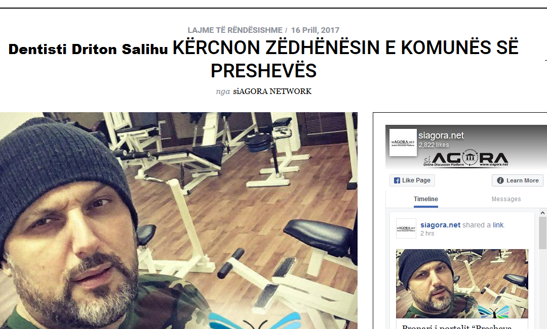 Preshevë, 16 prill -Mbrëmë pas mesnatës nje dentist me emrin Driton Salihu, njeherit pronar nje portali ka kërcnuar me jetë zëdhënësin e Kabinetit të Kryetarit të komunës së Preshevës, z.Abdulla Ahmedi, njofton siagora.net