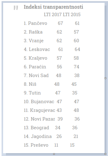 Panceva është qeveria më transparente lokale në Serbi dhe Preshevës ka mbetur në fund të indeksit shkallë të transparencës, qe nenkupton edhe me e korruptuara, sipas një organizatave qe ka zhvilluar se fundit një sondazh ne bashkepunim me OSBE-në