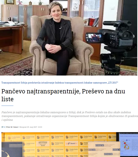Panceva është qeveria më transparente lokale në Serbi dhe Preshevës ka mbetur në fund të indeksit shkallë të transparencës, qe nenkupton edhe me e korruptuara, sipas një organizatave qe ka zhvilluar se fundit një sondazh ne bashkepunim me OSBE-në