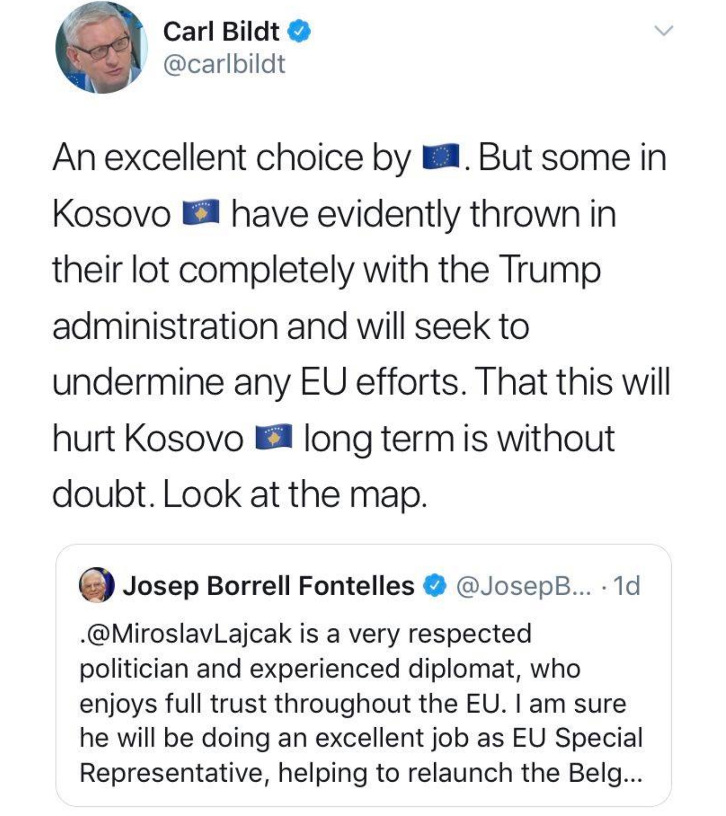 Artan Behrami, këshilltar politik i Presidentit të Kosovës, Hashim Thaçi, në profilin e tij në Twitter ka shkruar se Kosova nuk ka nevojë për emërime, të cilat e qetësojnë Serbinë dhe e poshtërojnë Kosovën.“Sinqerisht, vetëm emërimi i juaj mund të ishte më i keq se Lajçak. Të qetësosh Serbinë dhe ta bësh Rusinë të lumtur nuk është qëllimi ynë. Ne thjesht po kërkojmë dikë të paanshëm si ndërmjetës”, ka shkruar Behrami.