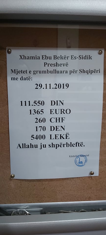 Po ju paraqasim një listë e cila tregon me saktësi shumat të cilat janë mbledhur sot në xhaminë e madhe Ebu-Bekker Ess-Sidik në Preshevë.