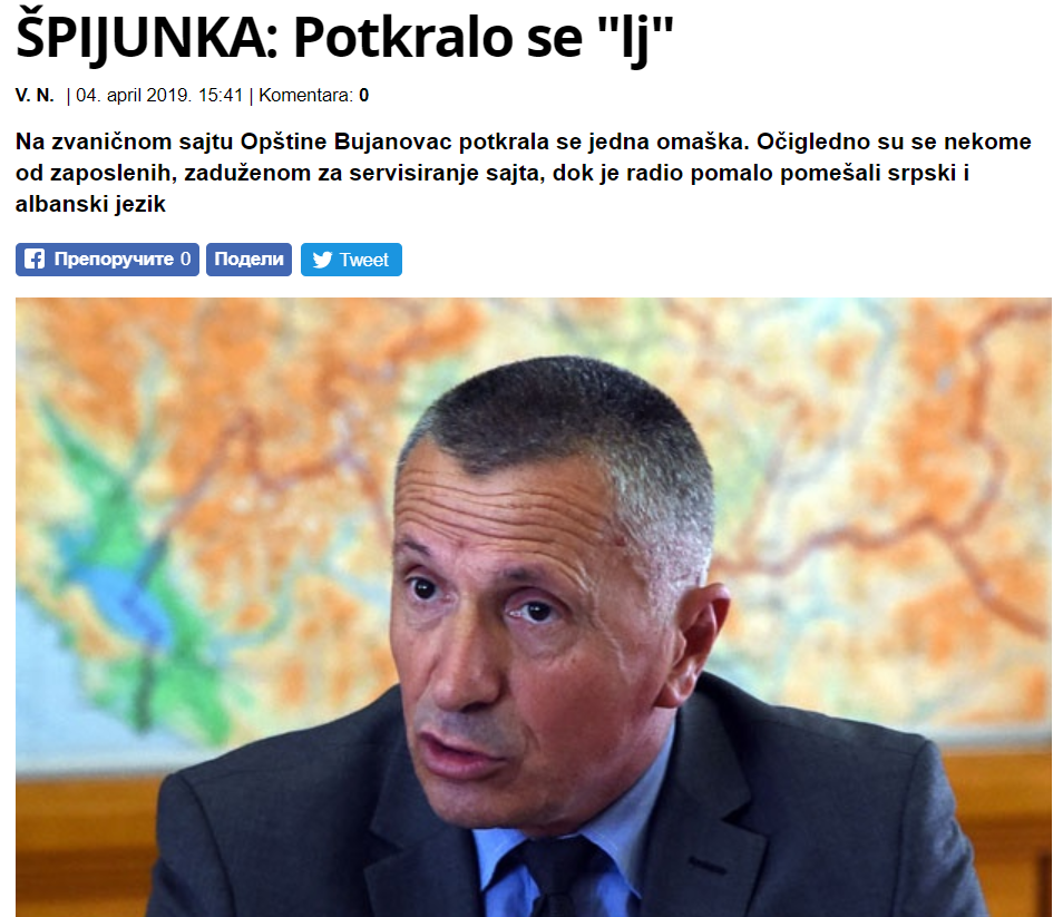 Në faqen zyrtare të internetit të Komunës së Bujanocit, ka pasur një përleshje, shkruna nje gazete serbe ne shkrimine saj me titull: “ŠPIJUNKA: Potkralo se “lj”, transmeton gazeta serbe “Vecerni Novosti”