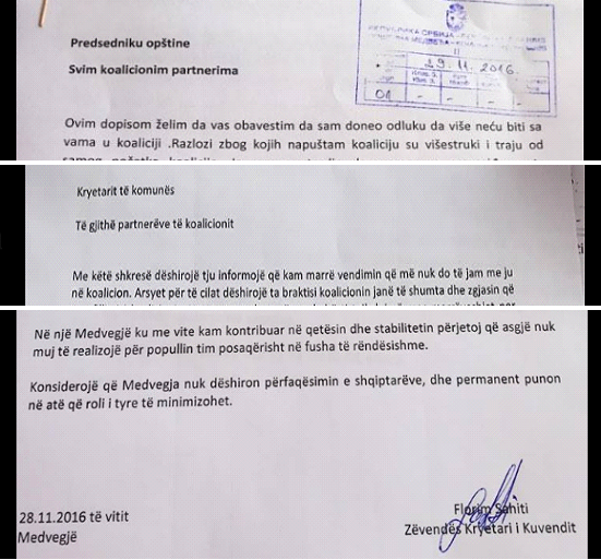 Terheqjen nga pushteti lokal ne Medvegje zyrtarisht permes nje letere e ka kofrimuar edhe zevendes kretari i Kuvendit të Medvegjes Florim Sahiti permes nje letere derguar kryetarit te Kuvendit, serbit Nebojsha Arsic. Premes kesaj letra ju njoftoj se ne nuk jemik me ne koalicion me ju, shkaqet dihen. Në nje Medvegje qe me vite jam perpjekur te punojë dhe kontribuoj per nje vend te qetë dhe stabil, kjo nuk eshte arritur sidomos ndaj popullit tim asgje nuk u realizuiar. Prandaj, shikuar sitauten aktule ne , konsideroj se Medvegja nuk e deshiron perfaqesimin e shiqptareve ..”