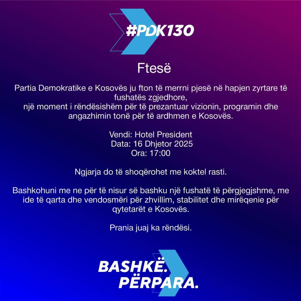 “Bashkohuni me ne për të nisur së bashku një fushatë të përgjegjshme, me vendosmëri për zhvillim dhe mirëqenie për qytetarët e Kosovës”, thuhet në ftesën publike të Degës së PDK-së në Gjakovë.