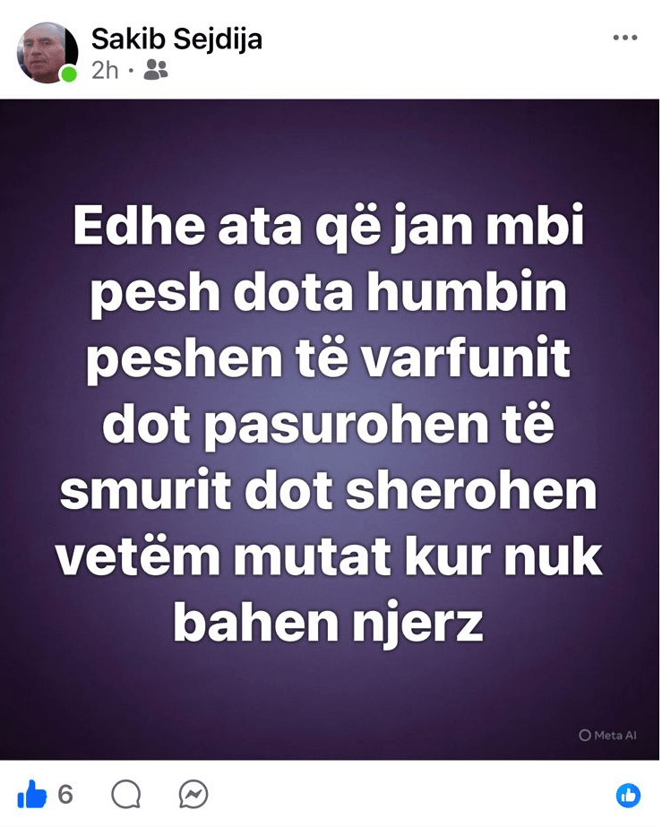 Në postimin e tij në Facebook, Sakib Sejdija shkruan: “Edhe ata që janë mbi peshë do ta humbin peshën, të varfunit do të pasurohen, të smurit do të shërohen, vetëm mutat, kur nuk bahen njerëz.”
