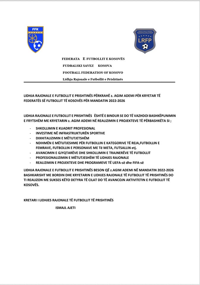 Me anë të një shkrese të publikuar në llogarin e tyre në facebook, Lidhja Rajonale e Futbollit të Prishtinës ka shprehur përkrahjen e fuqishme që ia jap in presidentit aktual të Federatës së Futbollit të Kosovës, njëherit edhe kandidatit të vetëm për zgjedhjet e ditës së nesërme brenda këtij intitucioni, z. Agim Ademi.