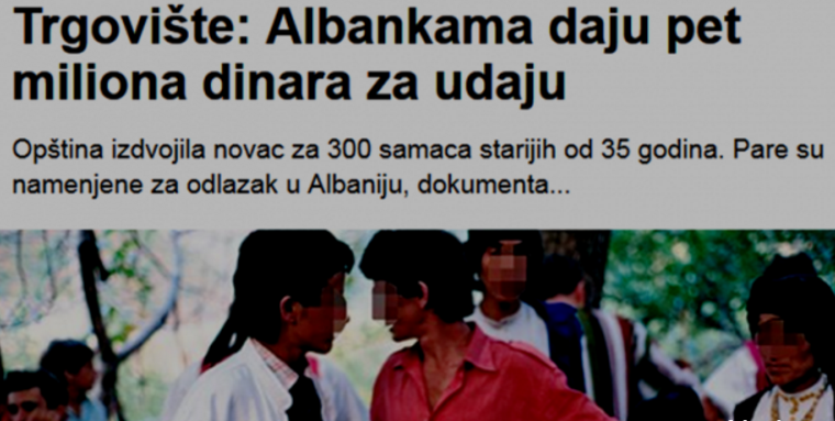 albbvPreshevë, 7 tetor  -Në komunat e Bujanocit, Preshevës dhe Trgovishte në vitin e kaluar kishte përfunduar gjashtë martesat mes serbëve dhe vajzave nga Shqipëria. Këta janë njerëz kryesisht të moshuar të vetme që janë të martuar me ndihmën e një mbles. Tre muaj më parë, dhe Bratislav Tasic nga Lopardinca afër Bujanovcit, ai u martua me një shqiptar nga Tirana. (“Bujanovac, šest brakova između Srba i devojaka iz Albanije.Tasić kod Bujanovca venčao se sa Albankom Dhurata iz Tirane.“)