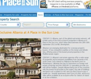 Më tej në artikullin e revistës britanike citohet se, Shqipëria është një nga vendet me barrën fiskale më të ulët në rajon, shitja e pasurive të patundshme dhe toka nuk janë subjekt i taksave dhe nuk ju nuk duhet të paguani asnjë taksë pasurie. Për të gjithë vizitorët e stendës në këtë panair të rëndësishëm dhe të përmasave botërore, “A place in the sun” do të ofrojë një mundësi ekskluzive për Shqipërinë duke u mundësuar atyre pamjet, objektet dhe informacionin më cilësor mbi vendin tonë, ku ofertat do të jenë të shumta. Apartamentet bregdetare ofrohen me një cmim që fillon nga 15 mijë dollarë por edhe vila luksoze me cmime shumë të arsyeshme. “A place in the sun” është mundësia më e mirë për të bërë të njohur pronat shqiptare në Mbretërinë e Bashkuar. Një portofol i zgjedhur pronash të territorit të Shqipërisë do të prezantohet në panairin më të madh të pasurive të patundshme të Mesdheut që mbahet në qendrën e panaireve NEC Birminghan më datat 28-30 shtator 2012. për herë të parë Shqipëria do të ketë një stendë të vetën në këtë panair, ajo do të prezantohet nga konsuilentët më të mirë të pasurive të patundshme, pjesë të sistemit Century 21. ekspozimi i pronave, trojeve, apartamenteve, rezidencave dhe projekteve të reja ambicioze do të shoqërohet sëbashku me një guidë të detajuar të procesit të marrjes së titullit të pronësisë nga një shtetas i huaj, jo resident në Shqipëri.