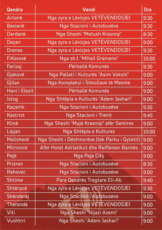 Vetëvendosje publikon orarin e nisjeve për protestën e nesërme